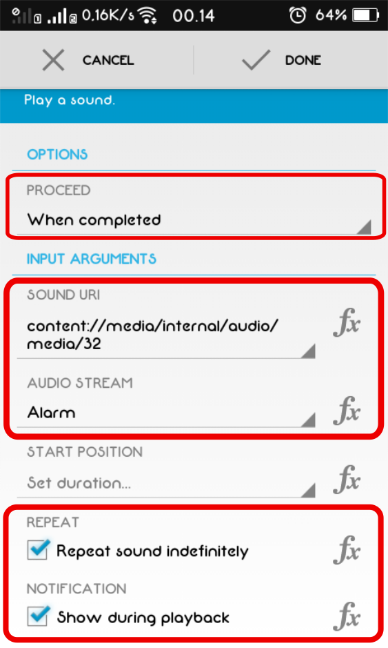 9. Pada bagian Sound play, atur Proceed menjadi When Completed. Pada kolom Sound URI, pilih musik yang akan digunakan sebagai ringtone alarm. Pada kolom Audio Stream, atur menjadi Alarm. Lalu, centang dua kotak (Repeat & Notification) yang berada di bawah kolom Start Position, agar ringtone selalu diputar sampai kita mematikan alarmnya. Jika sudah, klik Done pada bagian atas aplikasi.