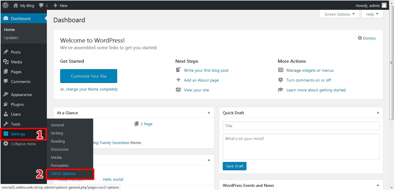 5. Masuk ke Dashboard Wordpress (‘Home‘ nya WordPress panel kamu). Lalu cari menu di sebelah kiri, kemudian sorot “Setting“, pilih “CWV2 Options“.