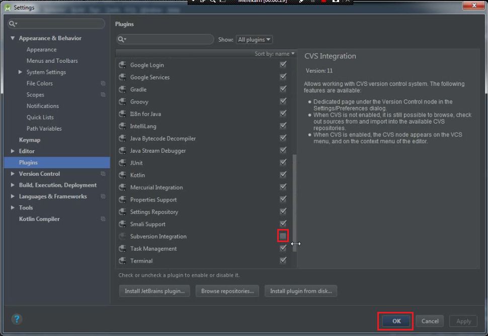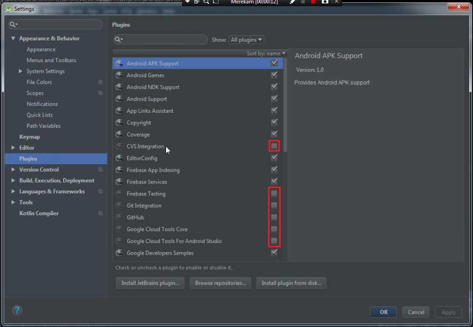 3. Klik pada menu plugins, dan hilangkan tanda centang untuk CVS Integration, Firebase Testing, Git Integration, GitHub, Google Cloud Tools Core, Google Cloud Tools For Android Studio dan Subversion Integration.