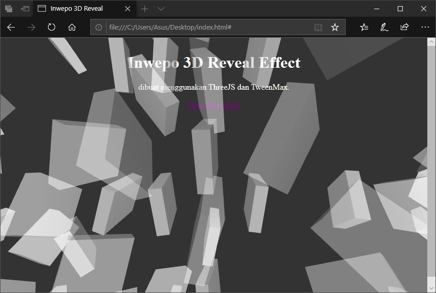 6. Save file yang telah dimodifikasi sebelumnya. Lalu, buka file index.html melalui browser kamu. Jika berhasil, nantinya halaman website akan menampilkan konten teks menyertakan animasi reveal yang dikemas dalam bentuk 3D pada awalannya. Sesuaikan penggunaan 3D Reveal dengan website yang telah kamu buat.