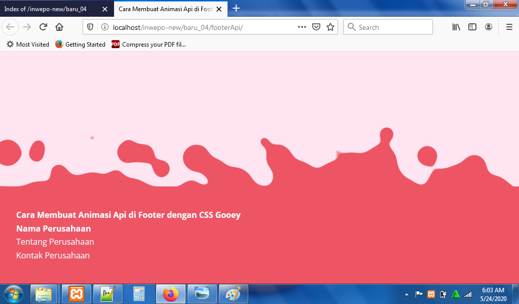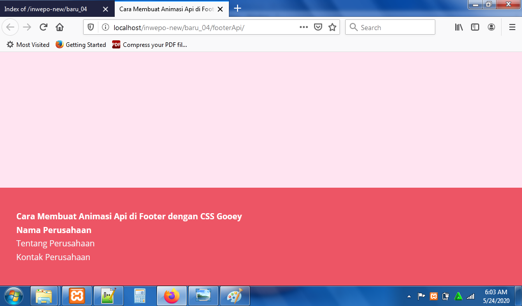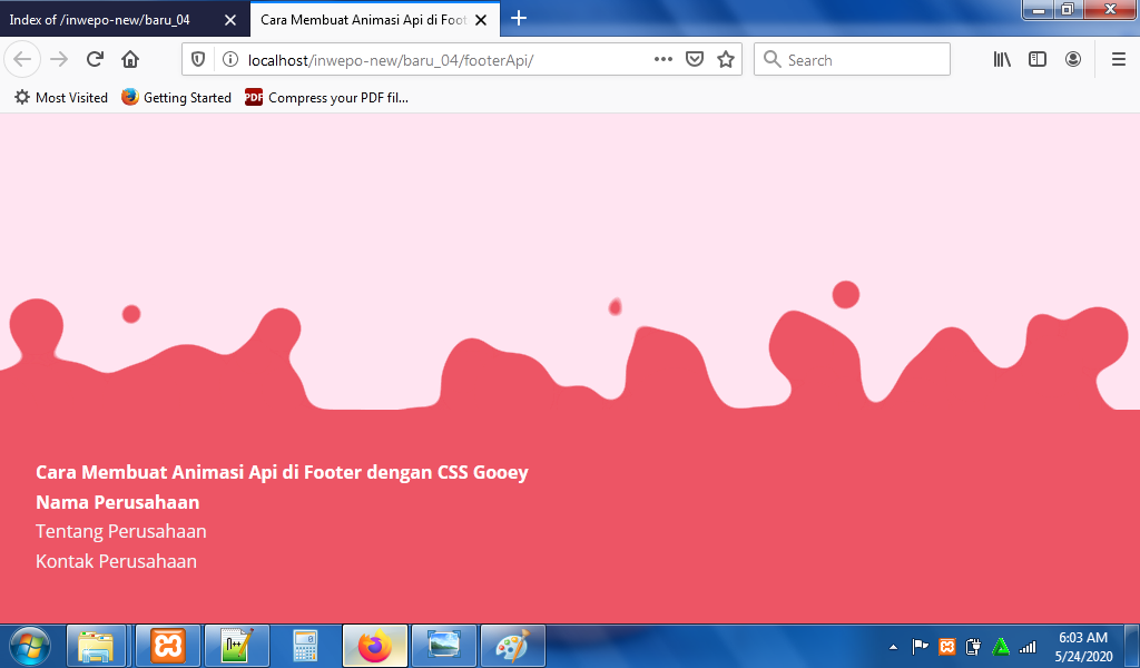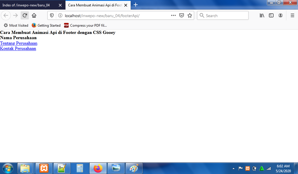 5. Reload alamat url : http://localhost/FooterApi. Tampilan dari footer, tapi animasi api di footer belum muncul.