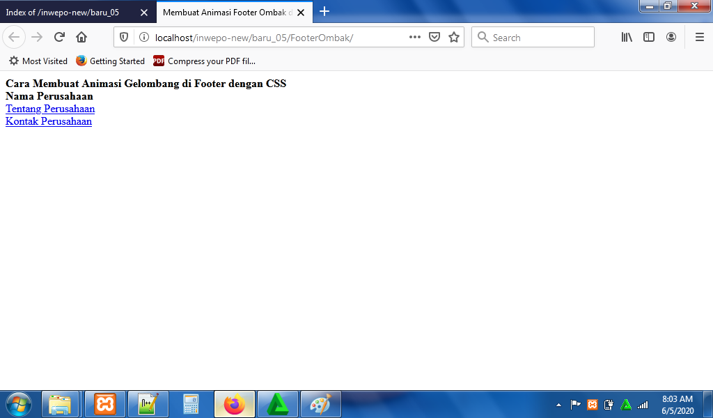 5. Refresh alamat url : http://localhost/FooterGelombang. berikut tampilan dari footer, namun animasi gelombang belum muncul.