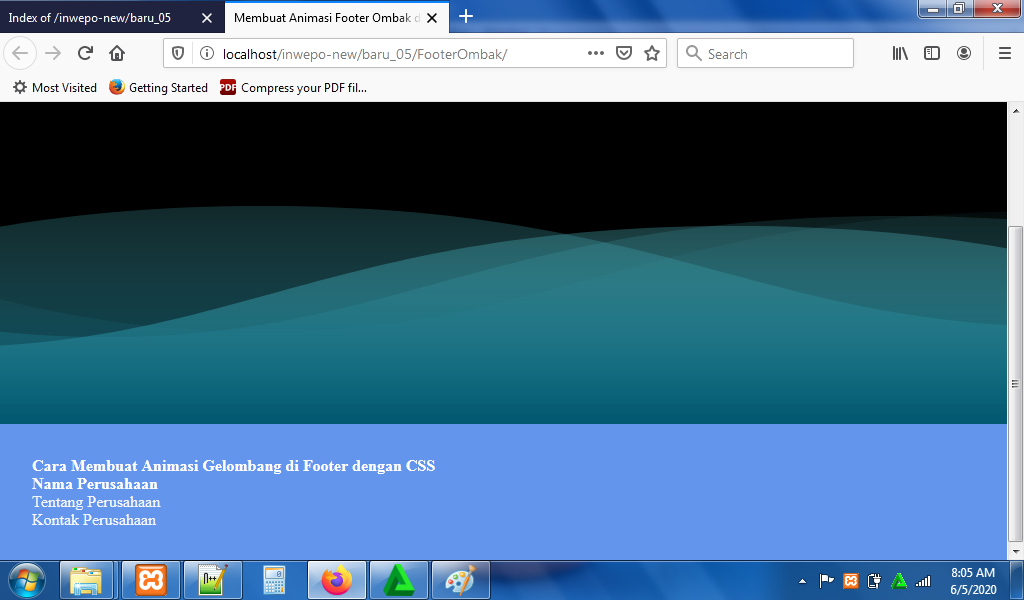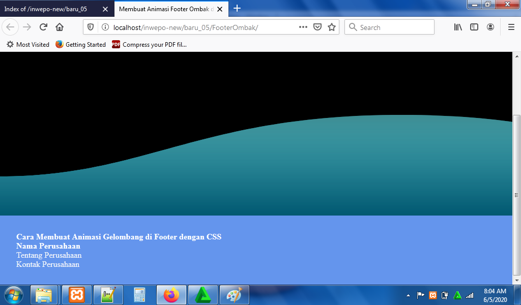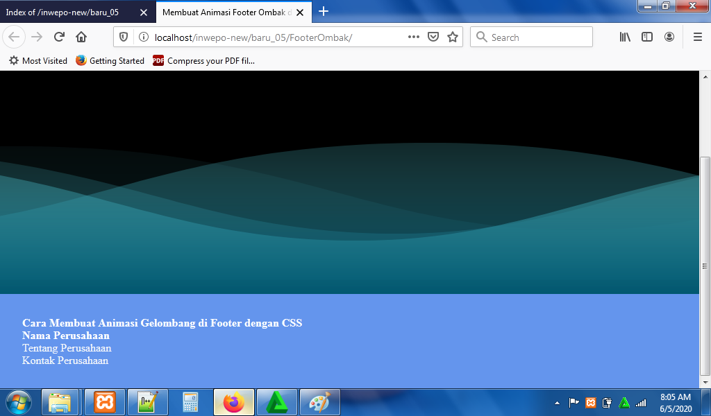 Simpan kode HTML5 diatas di folder xampplite -> htdocs -> buat folder baru dengan nama FooterGelombang -> simpan kode diatas dengan nama index.html.
