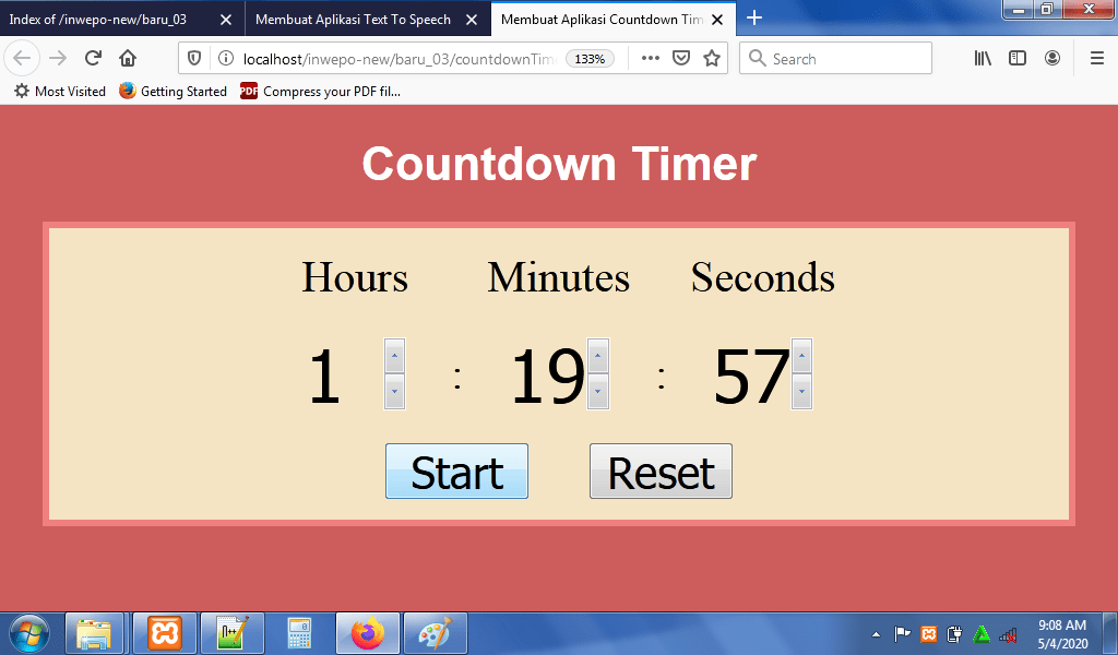 Simpan kode HTLM5 di atas di folder xampplite – htdocs – buat folder baru dengan nama CountdownTimer – simpan kode di atas dengan nama index.html.