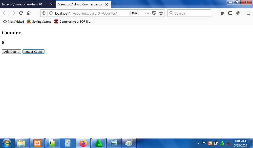 5. Reload alamat url : http://localhost/Counter. Tampilan dari aplikasi counter, namun aplikasi belum bisa menambah dan mengurangi angka.