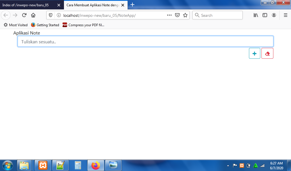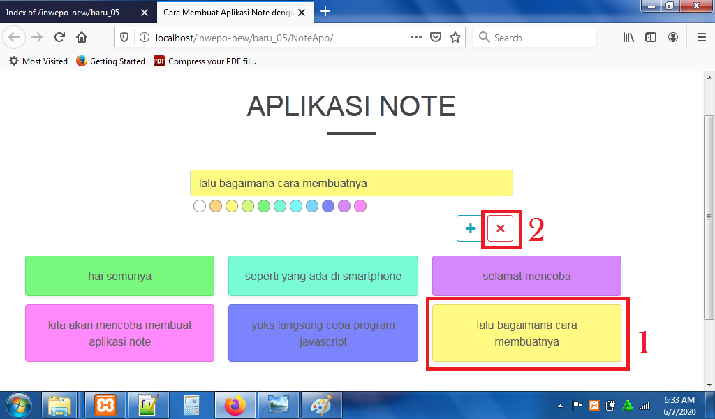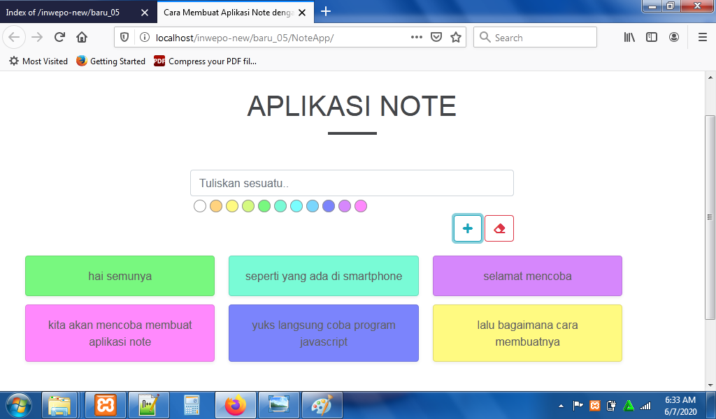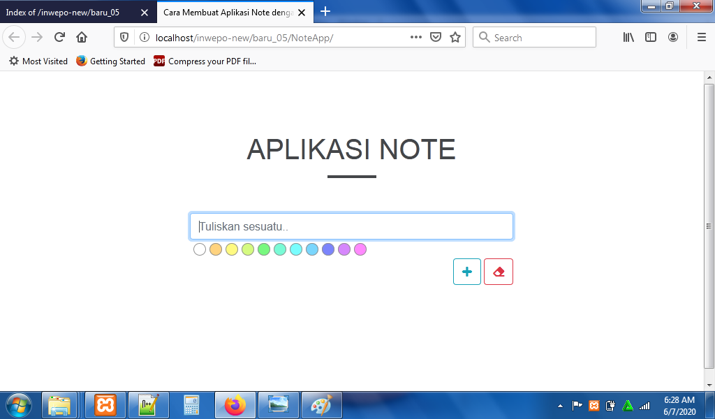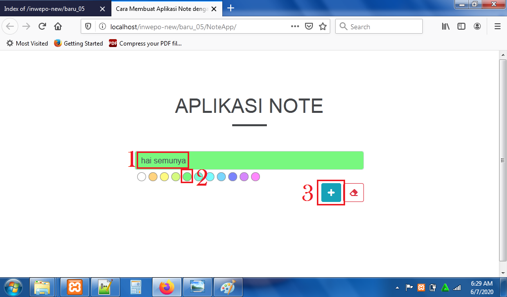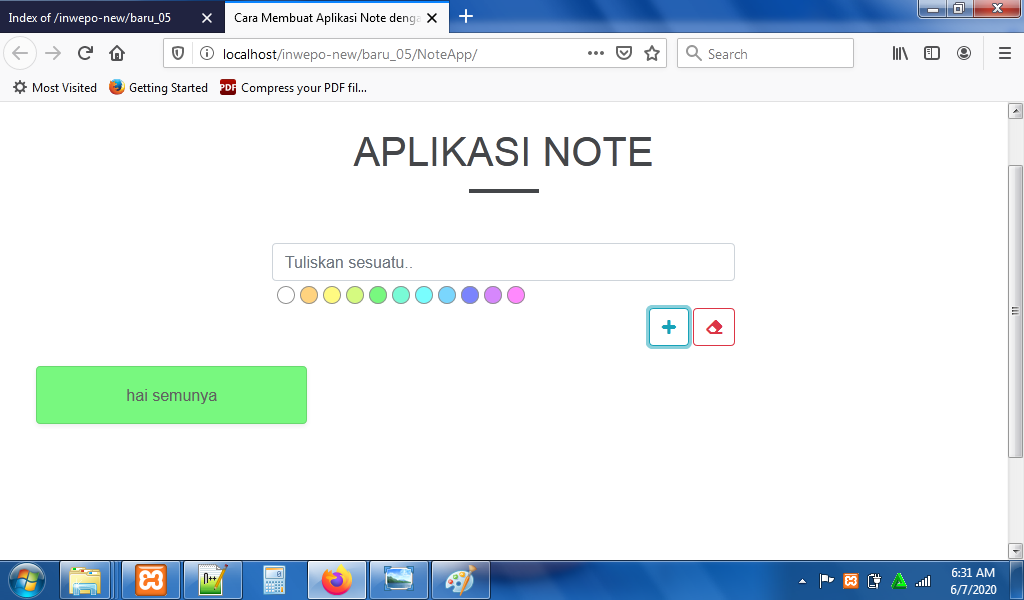 7. Reload alamat url : http://localhost/NoteApp. Tuliskan catatan di form – pilih warna catatan – klik ikon ‘+’.