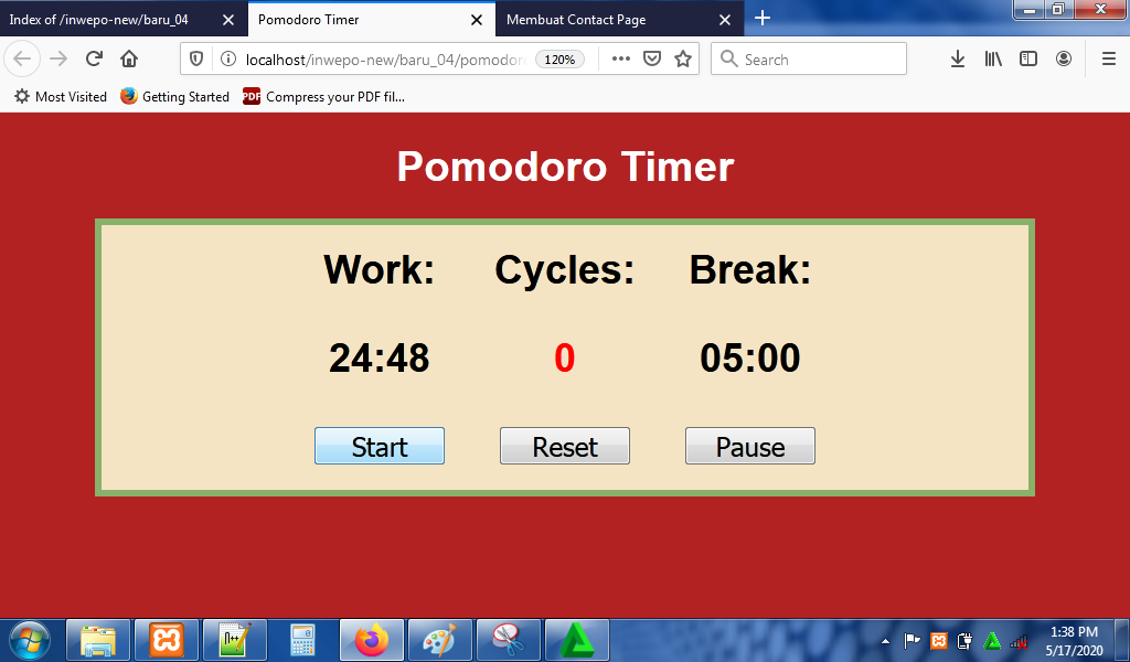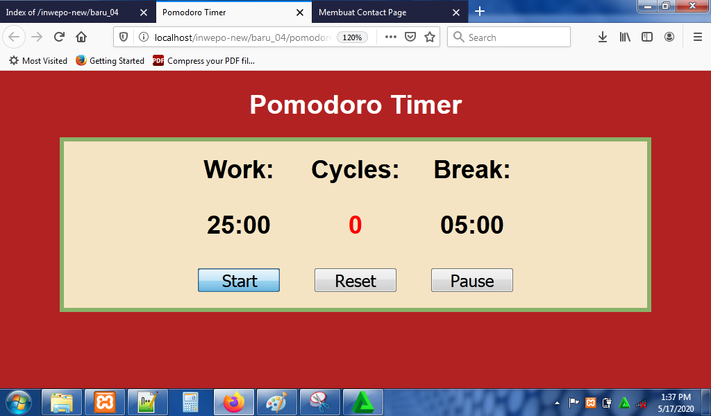 3. Untuk melihat hasil script code di atas, kamu bisa buka browser kamu ketiklah http://localhost/PodomoroTimer.