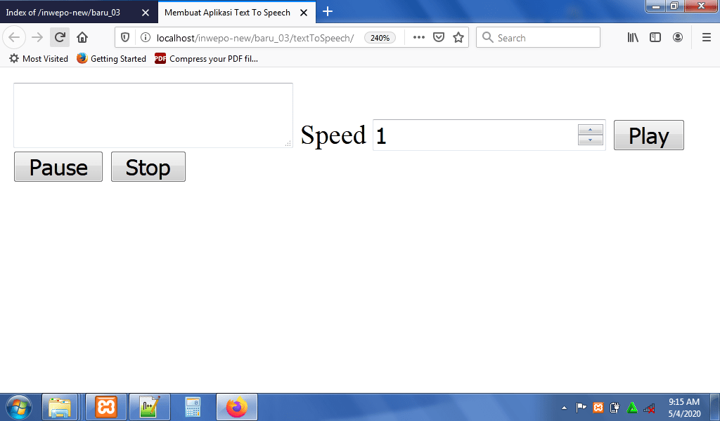 3. Untuk melihat hasil script code di atas, kamu bisa buka browser kamu ketiklah http://localhost/TextToSpeech.