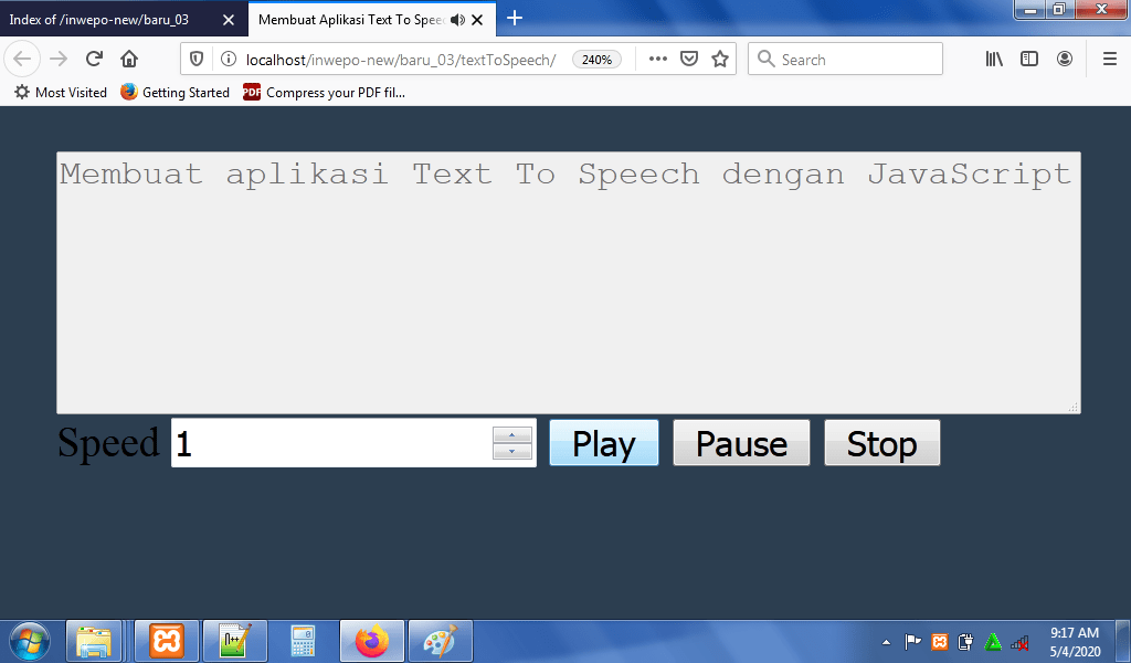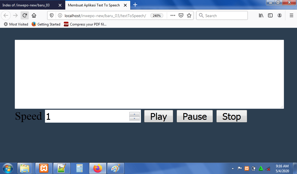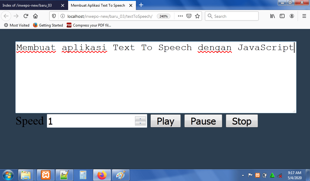 Simpan kode HTLM5 di atas di folder xampplite – htdocs – buat folder baru dengan nama TextToSpeech – simpan kode di atas dengan nama index.html.