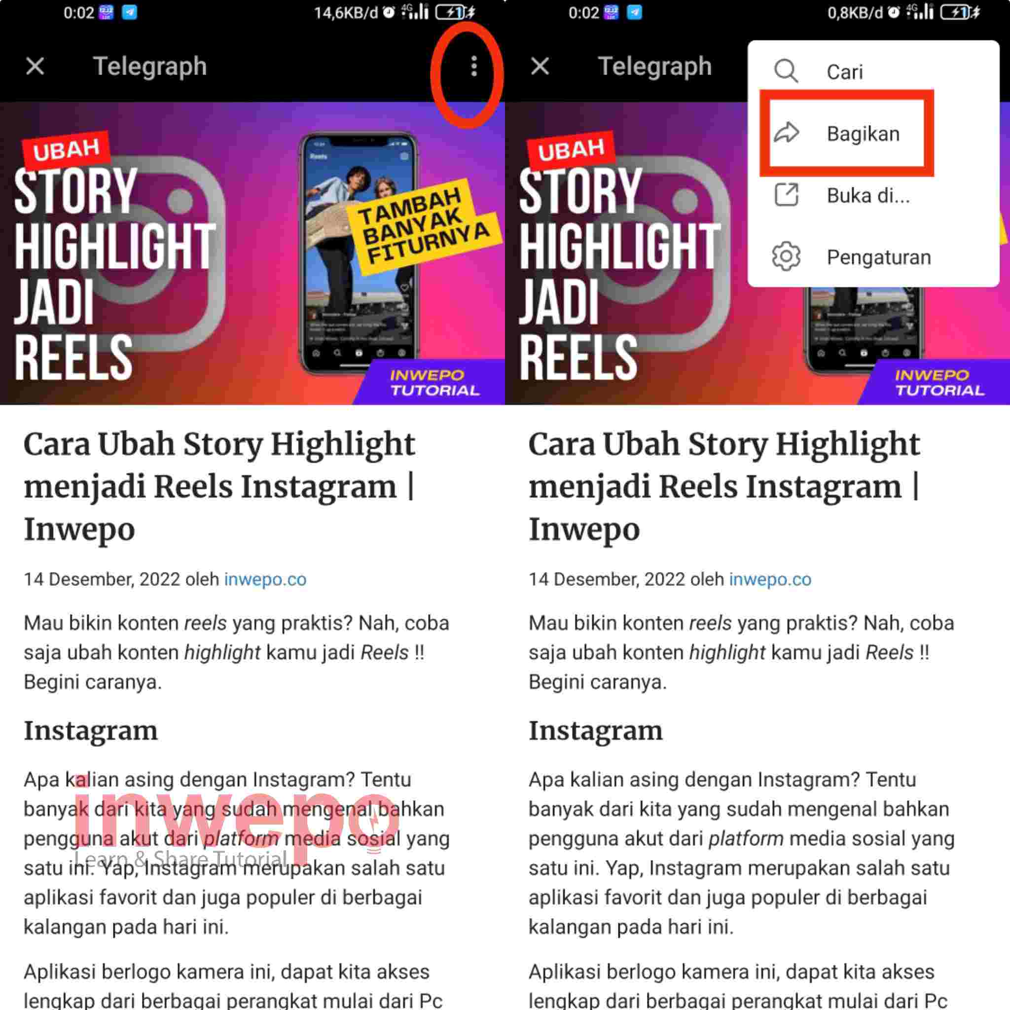 4. Tap 3 titik yang berada pada artikel instan view, kemudian tap menu Bagikan untuk membagikan link instan view yang sudah di buat untuk pengguna lain atau grup yang ada di Telegram kalian.