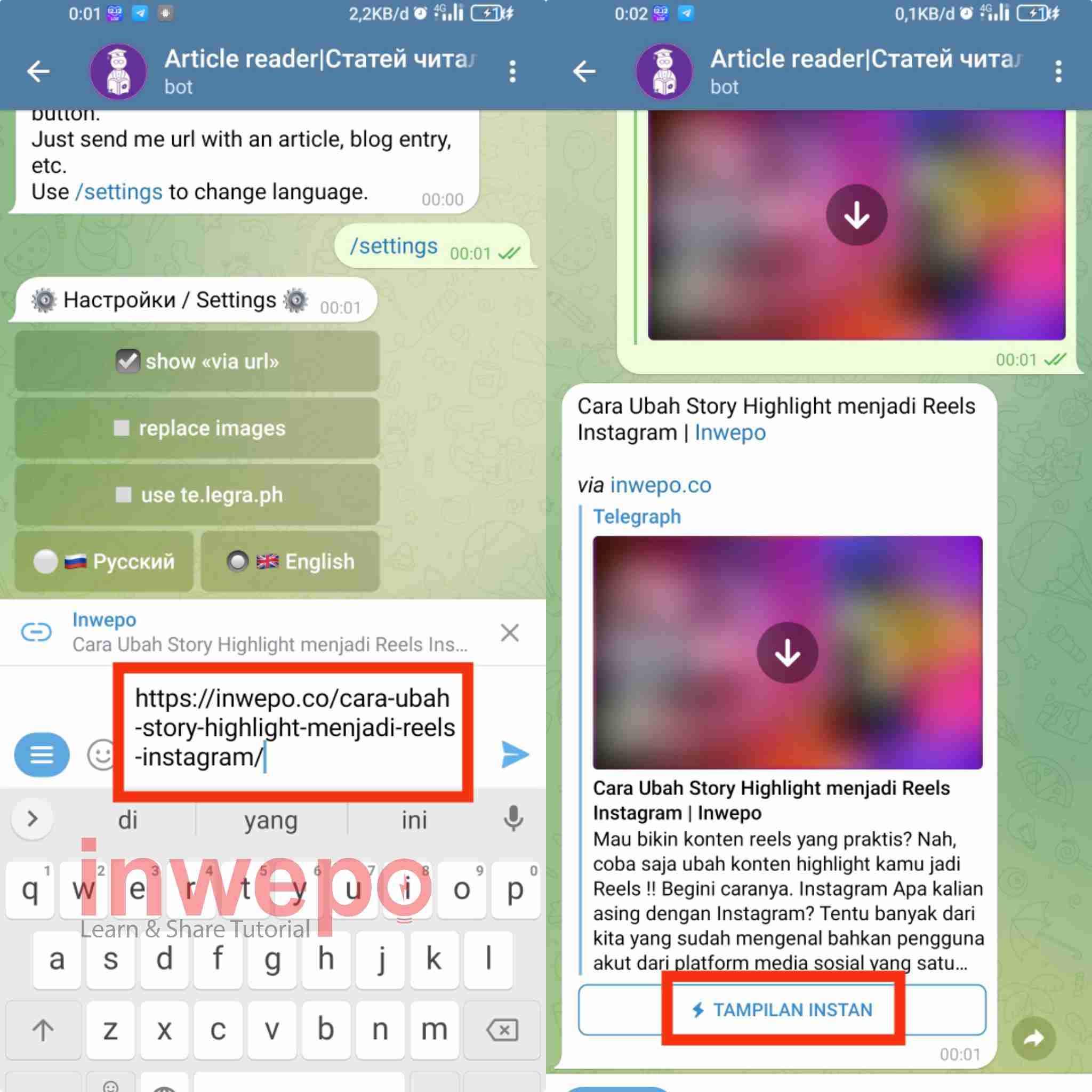 3. Paste link yang akan kalian buat menjadi Instan View. Tunggu bot memproses link kamu dan memberi balasan, jika sudah tap menu Instan View.