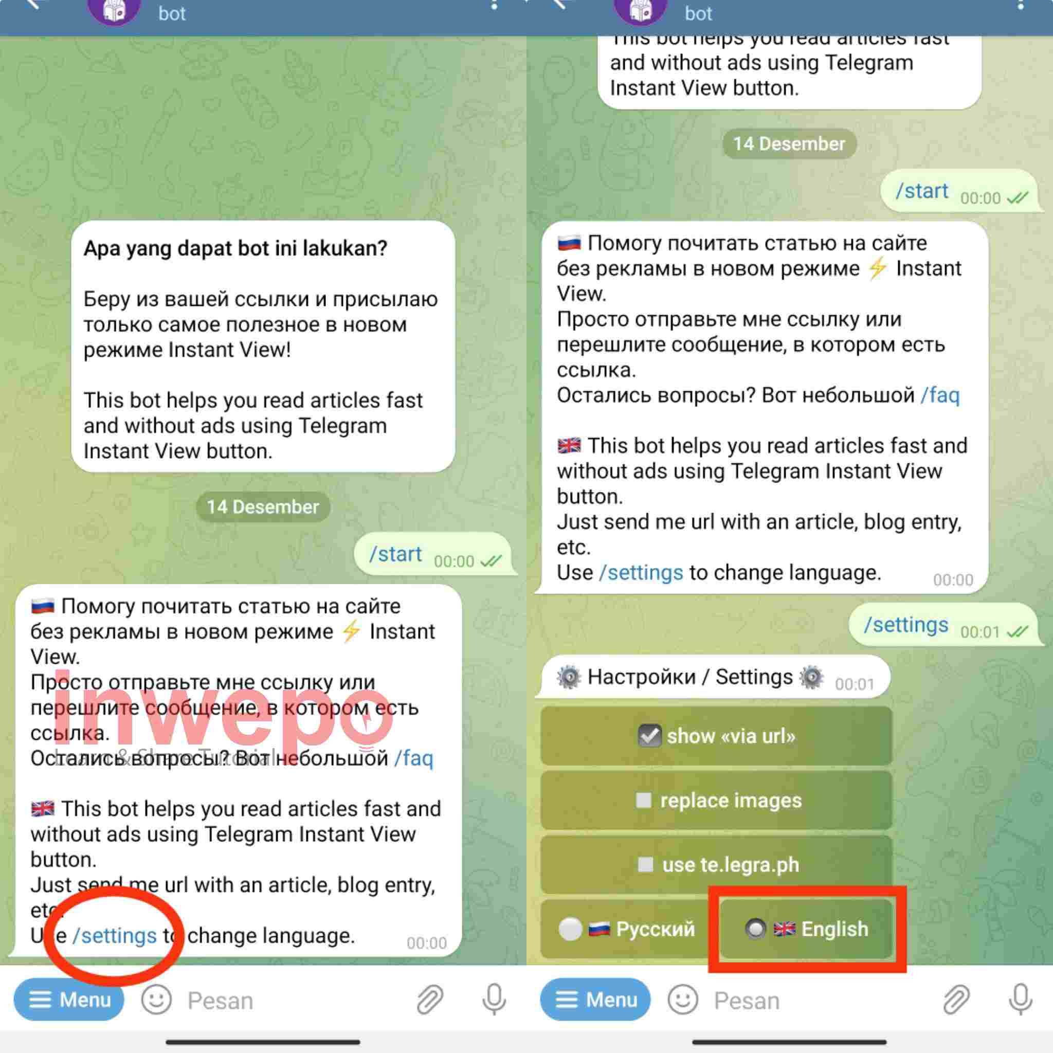 2. Pilih menu /settings pada reply chatbot, untuk mengganti bahasa. Agar mudah di mengerti kalian bisa pilih menu English (bahasa Inggris).