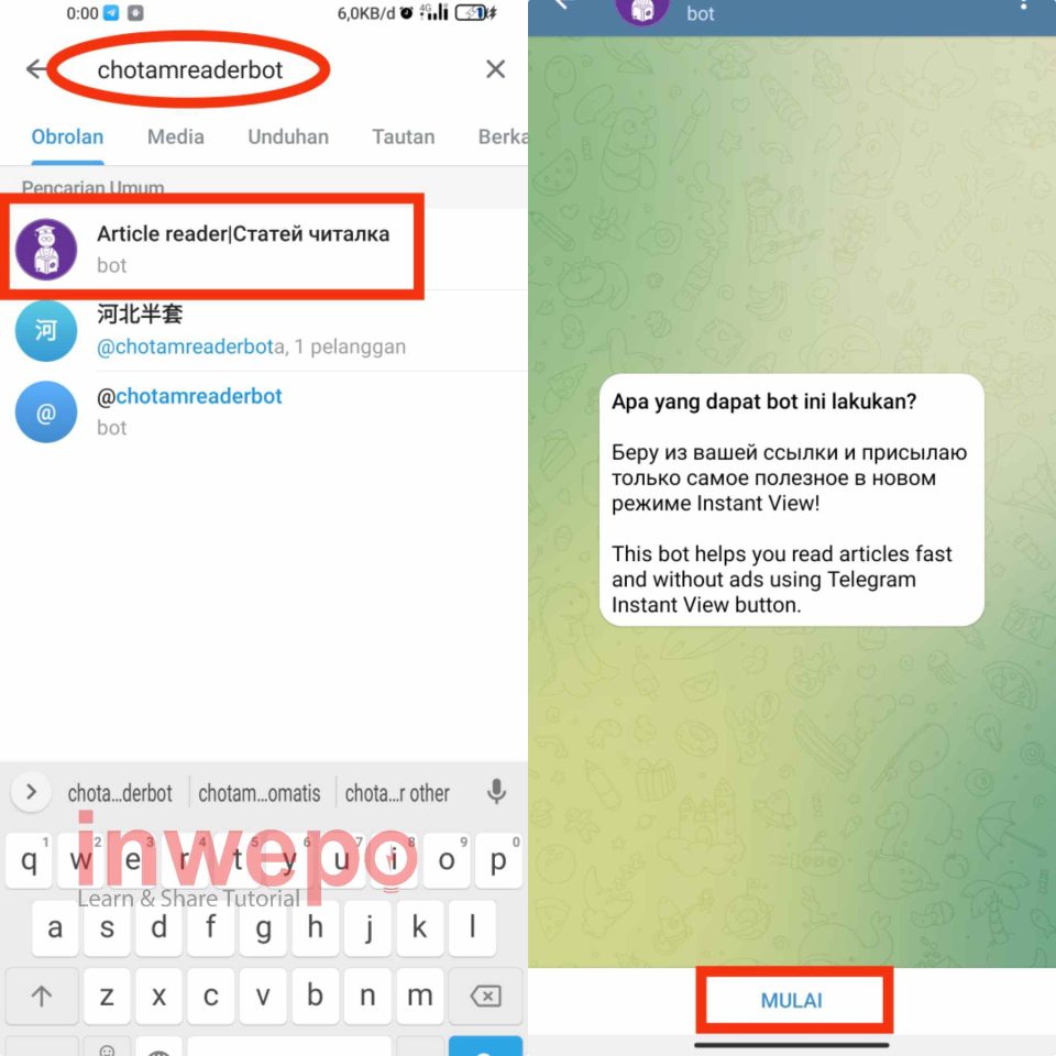 1. Cari akun @chotamreaderbot di kolom pencarian akun Telegram kalian masing-masing. Atau bisa pilih seperti gambar di bawah ini. Selanjutnya buka chatbot tersebut dan ketuk menu Mulai.