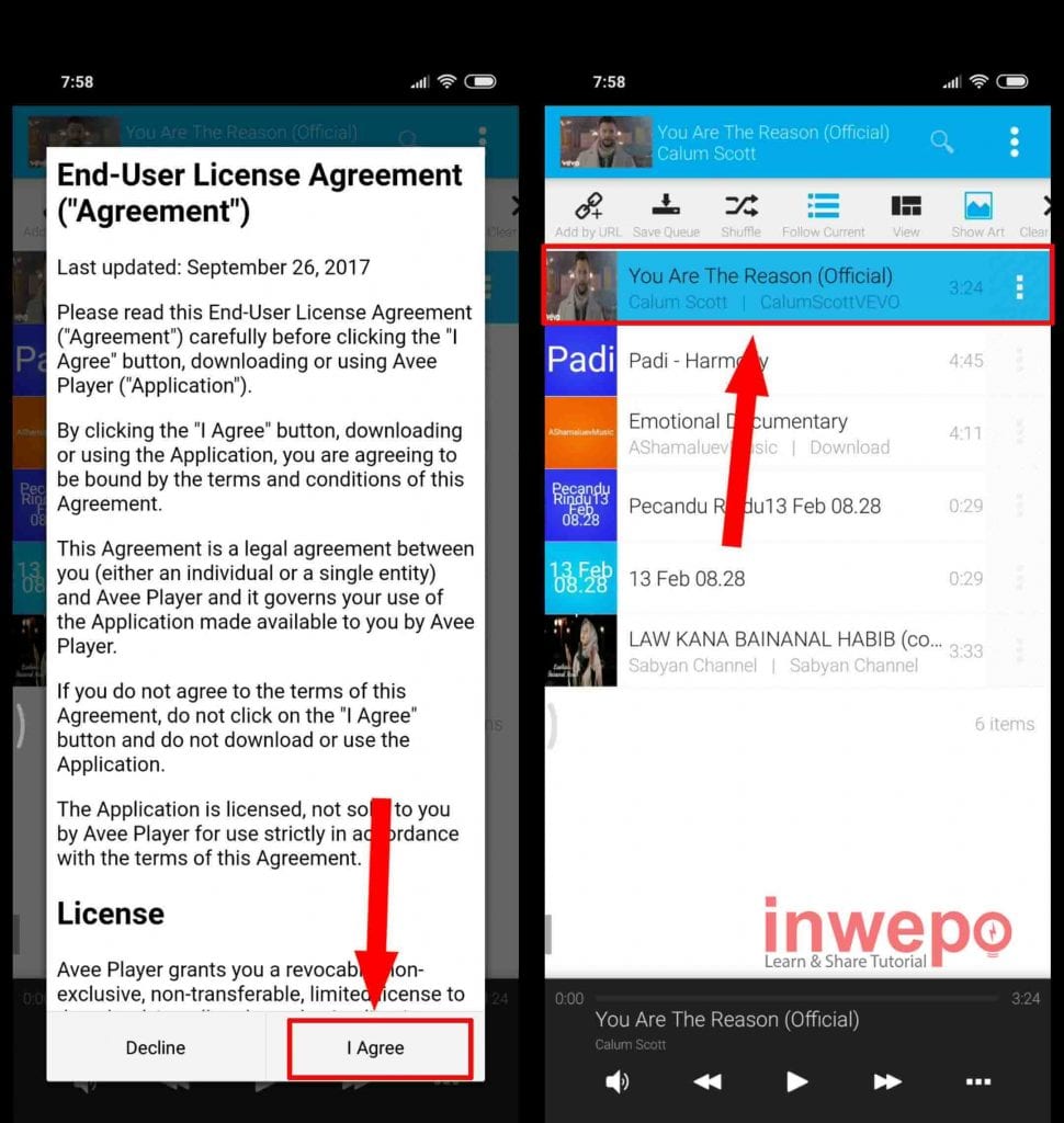 2. Buka aplikasi Avee Player yang sudah kita download lalu tap I Agree. Kemudian pilih lagu yang ingin kamu gunakan.