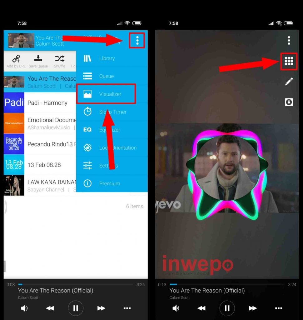 3. Tap 3 titik di pojok kanan atas lalu pilih menu Visualizer. Berikutnya tap icon kotak-kotak untuk mengubah style spectrum.