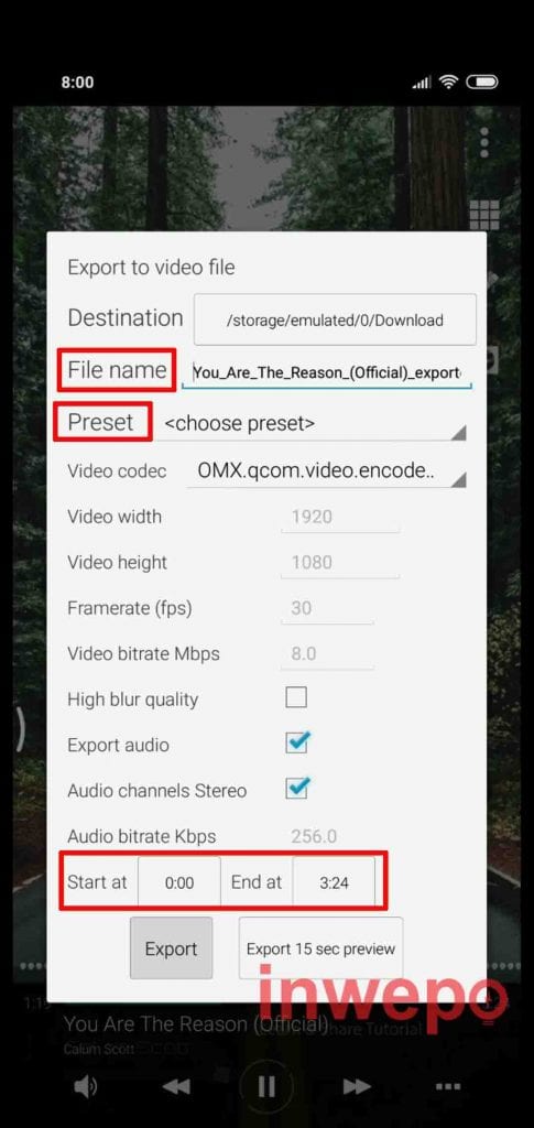 7. Gunakan menu File Name untuk mengubah nama file yang akan disimpan. Kemudian atur kualitas video pada menu Preset. Lalu atur durasinya pada menu Start dan End. Jika sudah semua tap Export dan tunggu proses penyimpannya beberapa saat.