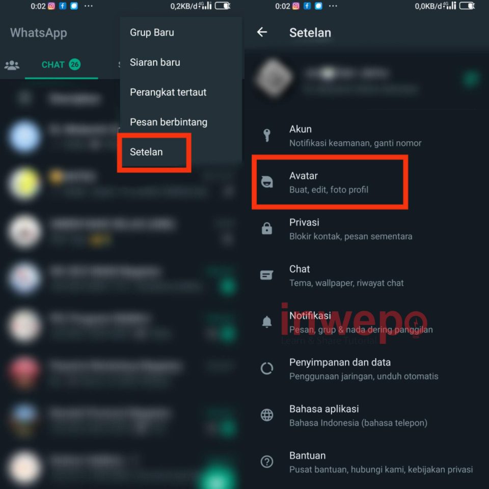 2. Tap 3 titik di pojok kanan atas untuk masuk ke menu lanjutan WhatsApp. Kemudian pilih setelan lalu tap menu Avatar.