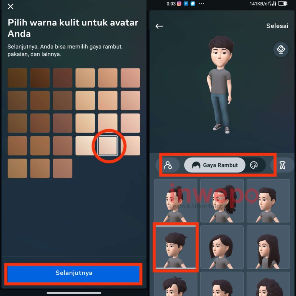 4. Untuk pertama kali disini kalian akan diminta untuk menentukan warna kulit, jika sudah ketuk menu selanjutnya. Lalu kalian bisa mengkustom Avatar semirip mungkin dengan kalian dengan memilih gaya rambut hingga aksesoris yang di pakai menggunakan menu yang sudah di sediakan.