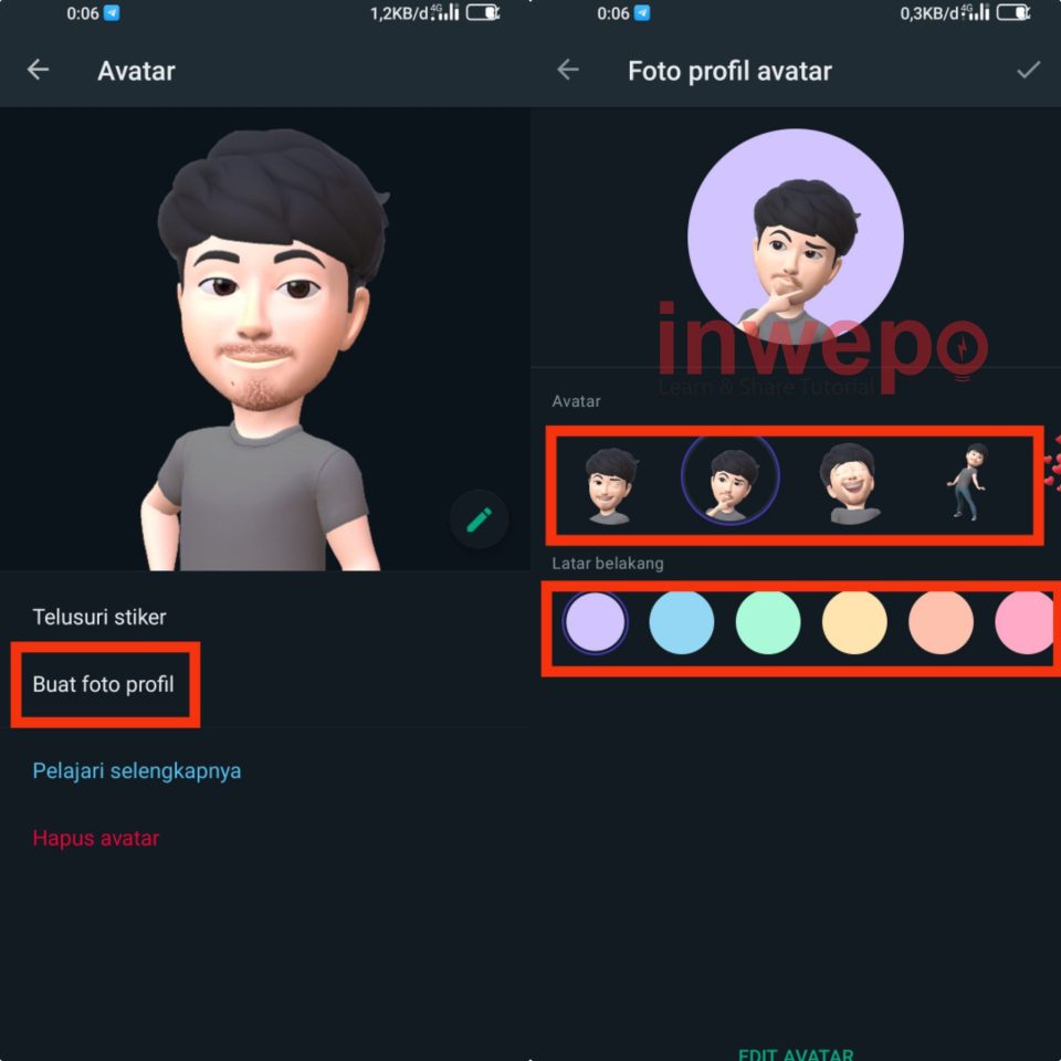 7. Kalian juga bisa menjadikan avatar sebagai photo profil dengan cara tap menu buat foto profil. Selanjutnya kalian tinggal memilih pose yang cocok beserta warna background yang akan digunakan, terakhir tap ceklist.