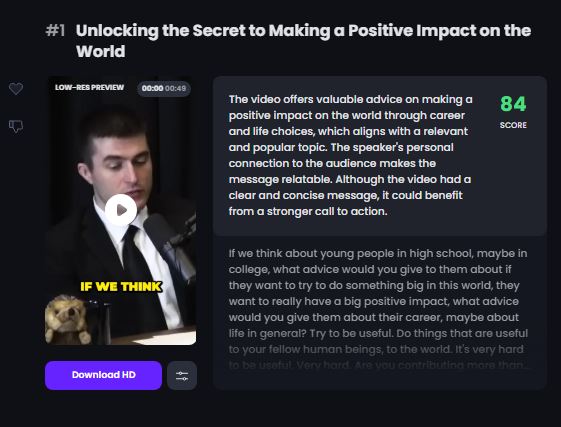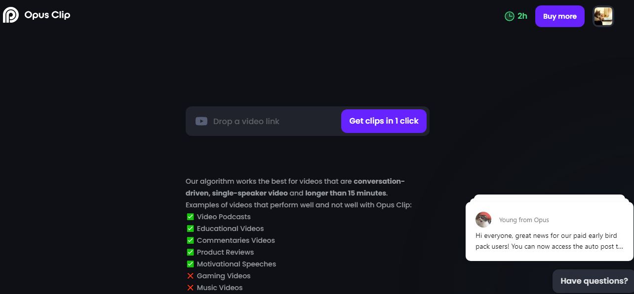 OpusPro adalah web application yang memudahkan kamu untuk membuat banyak video klip pendek dari video panjang yang ada di YouTube. Hanya dengan memasukkan link video panjang yang dinginkan untuk dipotong-potong, OpusPro, akan langsung bekerja secara otomatis. Web application ini sendiri berbasis AI dan dikembangkan oleh Open AI.