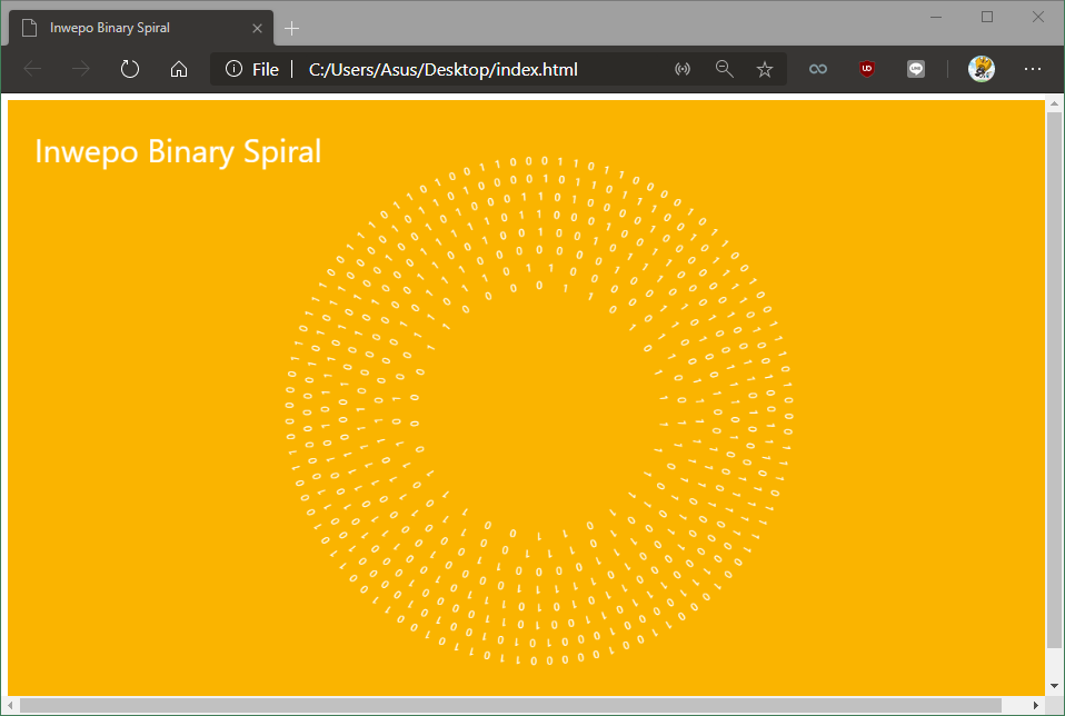 4. Save file yang telah dimodifikasi sebelumnya. Lalu, buka file index.html melalui browser kamu. Nantinya, halaman website akan berisikan animasi teks bergerak (dalam bentuk binary) yang ditampilkan dalam format spiral (/ lingkaran). Sesuaikan penggunaan animasi binary spiral dengan website yang telah kamu buat sebelumnya.