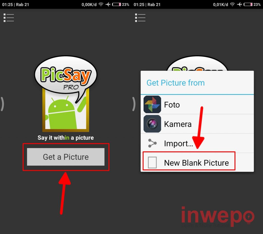 2. Langah kedua, tap Get a Picture untuk menambahkan gambar atau photo lalu tap New Blank Picture.