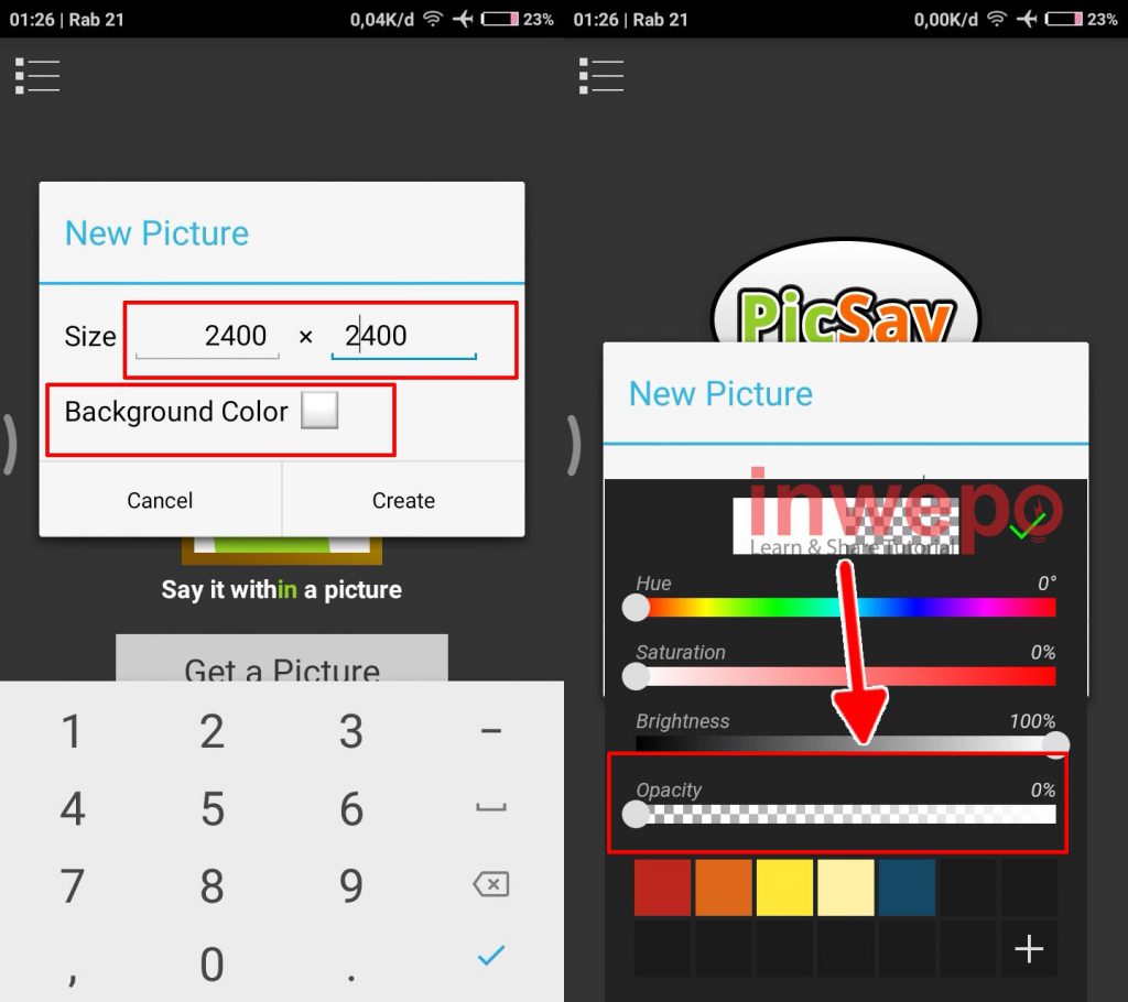 3. Langkah ketiga, atur Size di 2400 X 2400 selanjutnya tap Background Color dan atur Opacity di 0%.