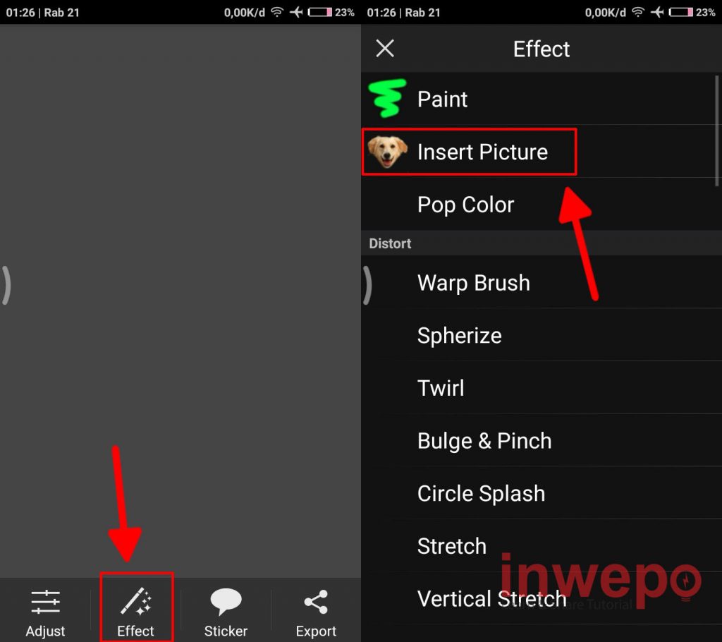 4. Langkah keempat, tap menu Effect berikutnya tap Insert Picture untuk menambahkan gambar dari galeri.