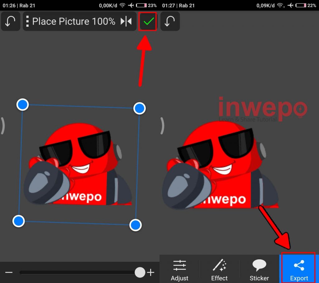 5. Langkah kelima, atur dan sesuaikan gambar yang akan kamu gunakan kemudian jika sudah tap Export untuk menyimpan hasilnya ke galeri.