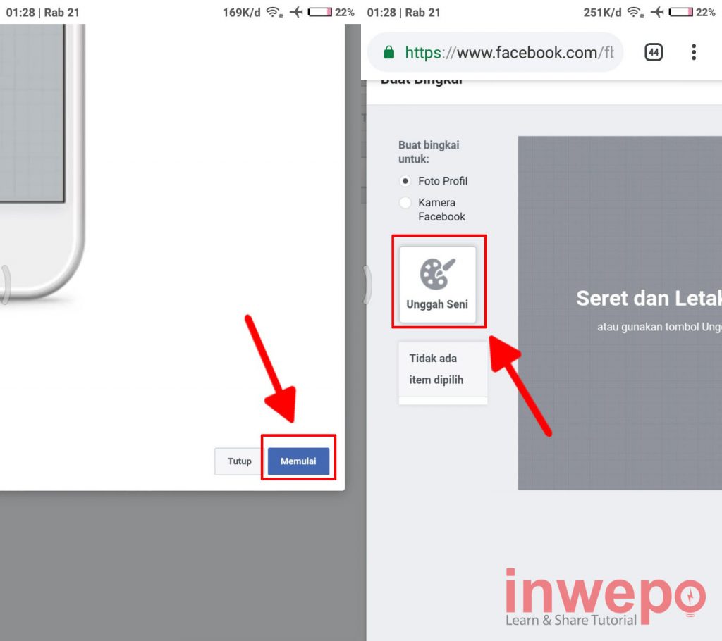 7. Langkah ketujuh, langsung tap Memulai kemudian tap Unggah Seni untuk memasukkan gambar yang sudah kamu edit sebelumnya.