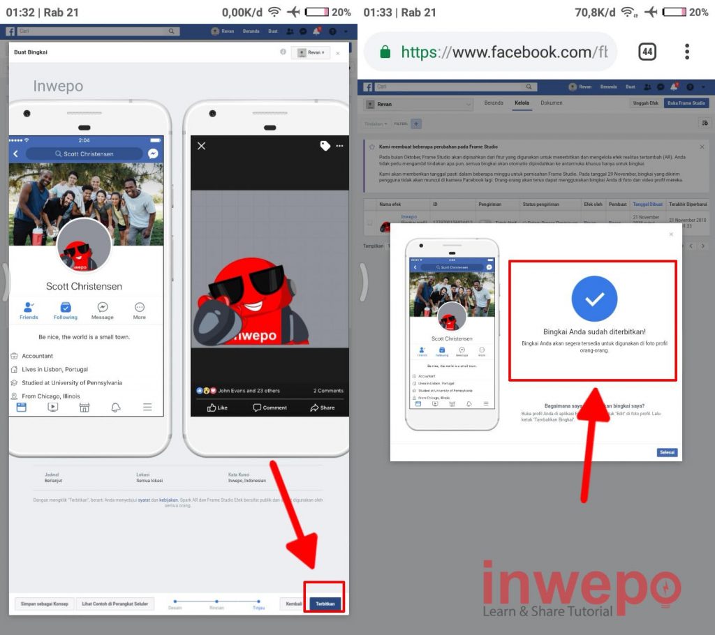 9. Langkah kesembilan, tap tombol terbitkan dan tunggu prosesnya beberapa saat. Jika berhasil akan ada notif bingkai berhasil di terbitkan dan kita tinggal menunggu proses moderasi dari Facebook hingga status frame yang kita buat aktif.