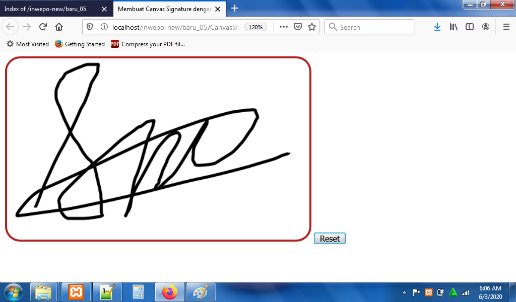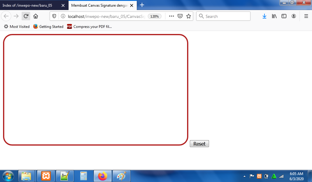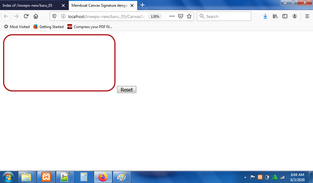 Simpan kode HTLM5 di atas di folder xampplite – htdocs – buat folder baru dengan nama CanvasSignature – simpan kode di atas dengan nama html. Karena script CSS hanya sedikit, maka script CSS akan di masukkan langsung di file index.html.