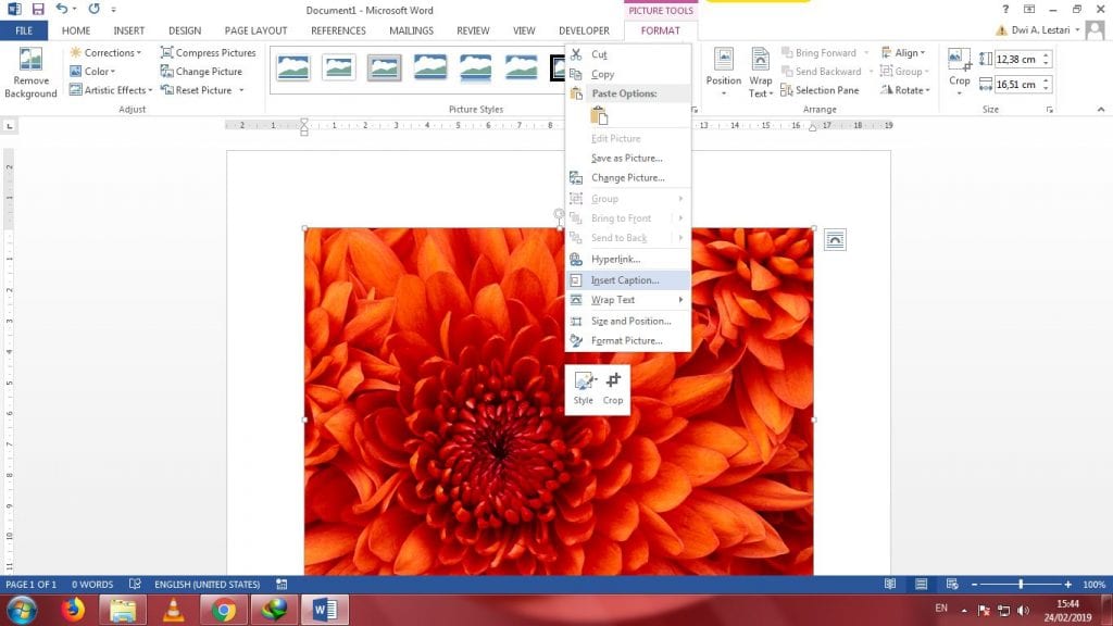 5. Klik kanan mouse pada gambar tersebut – Klik Insert Caption.