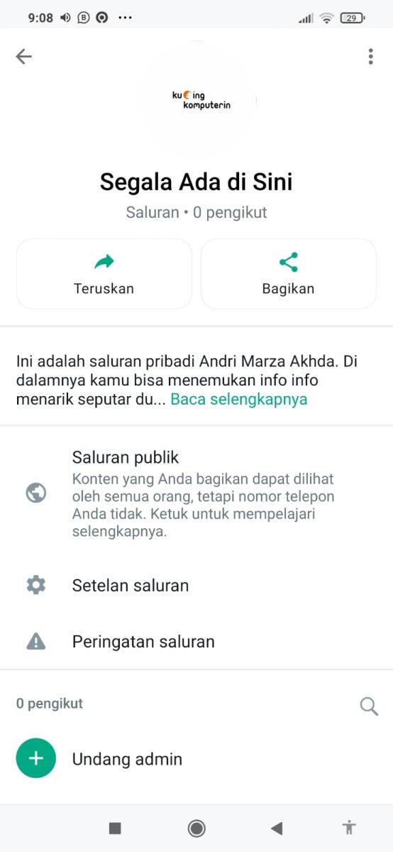 5. Inilah saluran yang tadi telah penulis buat. Kamu dapat merubah informasi yang ada sebelumnya, baik itu nama saluran, foto profil saluran dan deskripsi di bagian edit. Kamu bahkan bisa mengundang kontak lain di smartphone untuk jadi kontributor.
