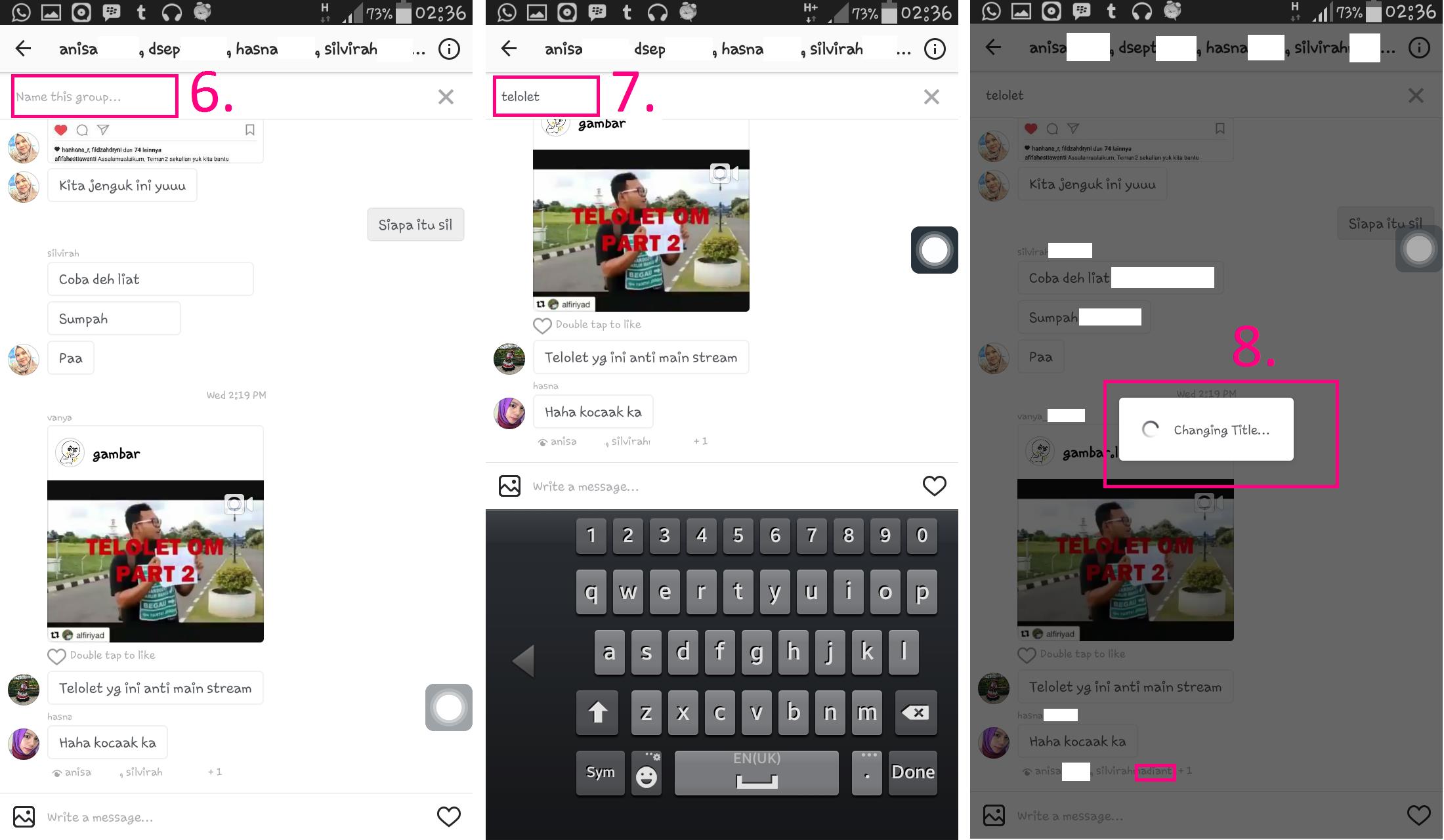 6. Selanjutnya anda bisa memberi nama chat group tersebut dengan tap pada bagian name this group, disitu anda bisa langsung menuliskan nama group sesuai keinginan anda, dan tunggu prosesnya.