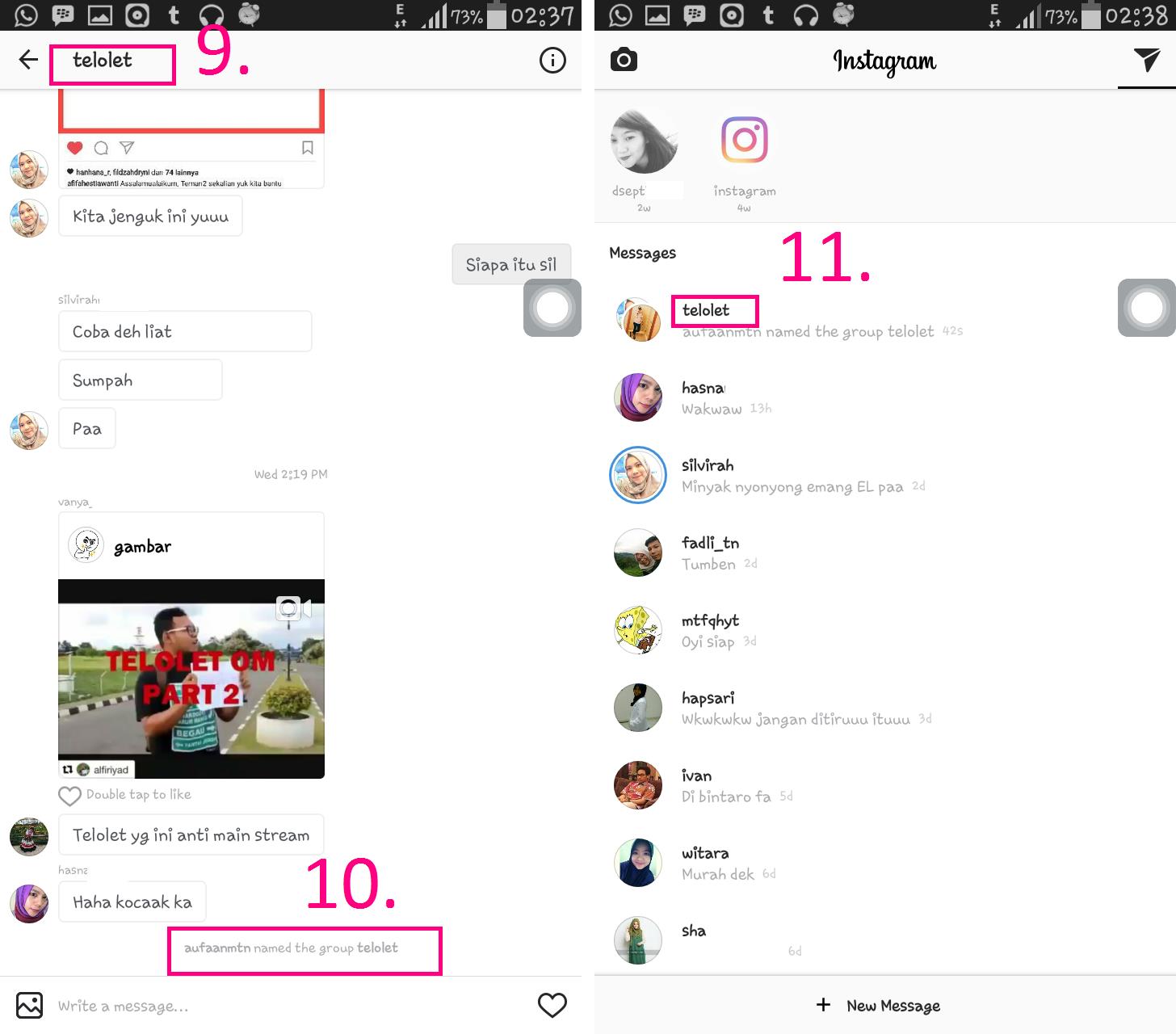 Kebanyakan dari kalian hanya mengetahui aplikasi instagram hanyalah sekedar shared moment seperti foto/ video, follow akun online shop, follow akun artis dan lain sebagainya, namun kini instagram sudah bisa melakukan percakapan dan juga sudah bisa membuat chat group untuk memudahkan pengguna dalam melakukan shared mengenai moment-moment mereka serta berbagi informasi yang tersedia di instagram kepada kerabat dekat seperti sahabat di dalam sebuah chat group.
