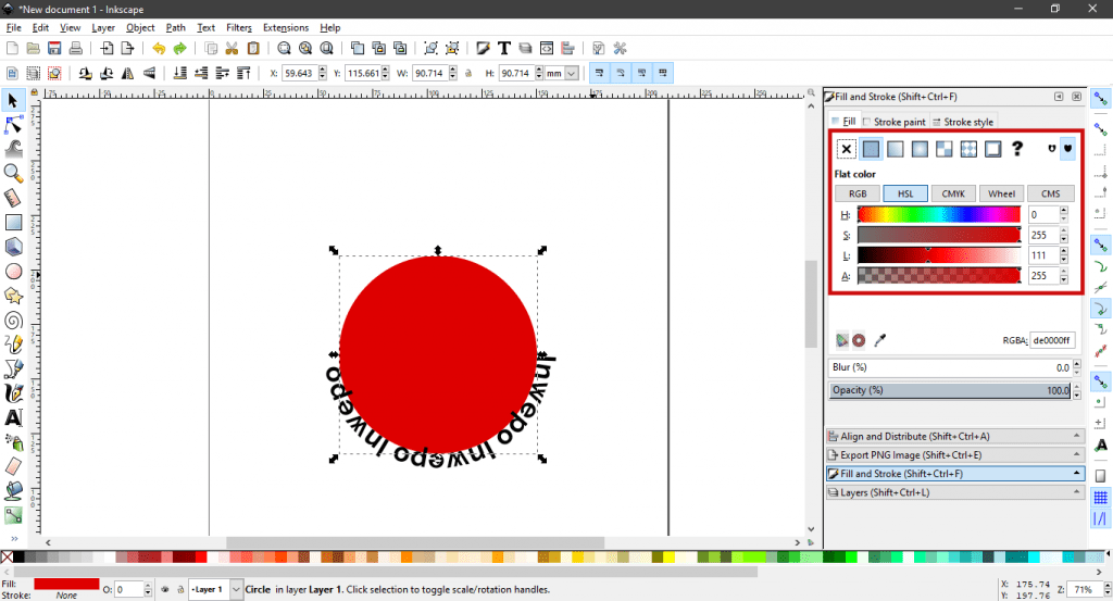 4. Setelah itu, kembali pilih obyek lingkaran (dimana sebagai medium dari obyek teks) pada navigasi canvas kamu. Lalu, bukalah navigasi Fill and Stroke (bisa dengan cara menekan SHIFT + CTRL + F atau menampilkannya melalui tab View). Pastikan bahwa komposisi warna pada lingkaran berada dalam kondisi transparan (/ tidak terlihat). Nantinya, obyek lingkaran akan tetap menjadi canvas dari obyek teks, hanya saja kita tidak ingin obyek lingkaran memiliki dasar warna yang dapat mengganggu tampilan akhir dari obyek teks.
