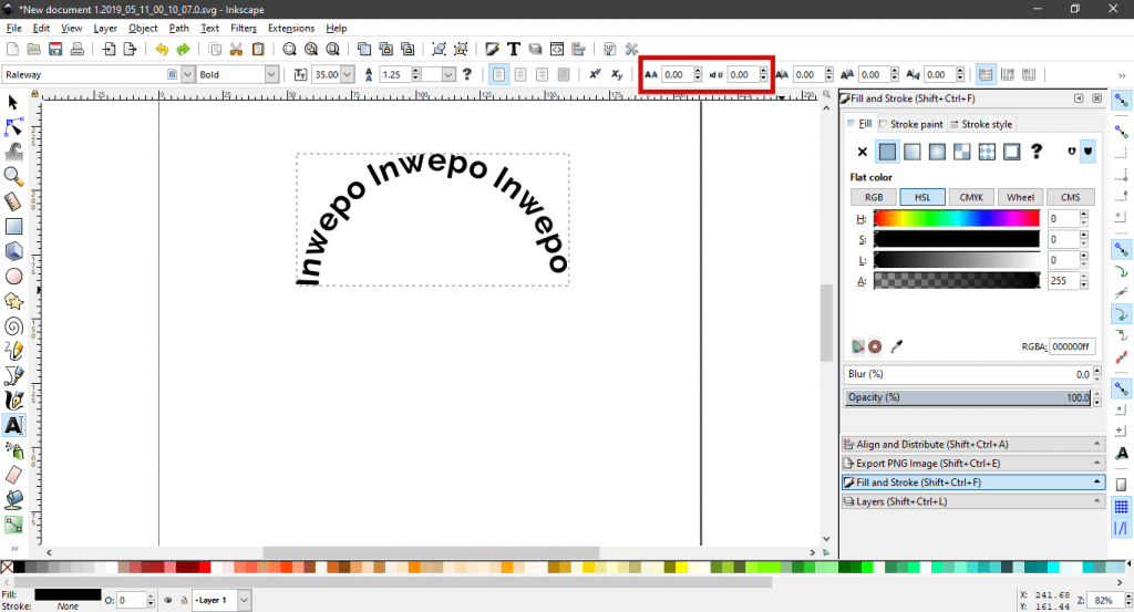 5. Untuk membentuk teks menjadi lingkaran sepenuhnya, klik obyek teks yan telah kita ubah layout-nya sebelumnya. Lalu, atur nilai Letter Spacing (/ Jarak Antar Huruf) serta Word Spacing (/ Jarak Antar Kalimat) pada counter yang telah disediakan.
