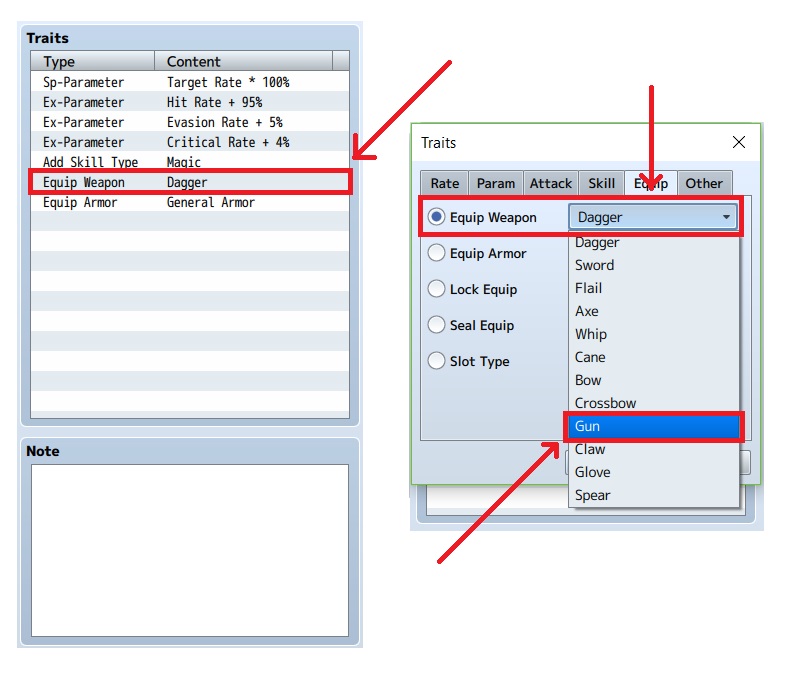 10. Jika kita geser ke sebelah kanan, kita akan mendapatkan menu “Traits”. Disini kita bisa mengatur apa-apa saja yang dimiliki class kita. Mulai dari hitrate, Evasionrate, apa yang dapat digunakan, dll. Kita akan melakukan sedikit perubahan saja disini. Ubah bagian “equip weapon” dari “dagger” menjadi “Gun” dengan cara double klik lalu ubah ke Gun. Kamu bisa tambahkan sendiri apapun yang kamu inginkan jika mau.