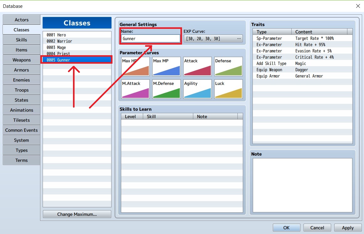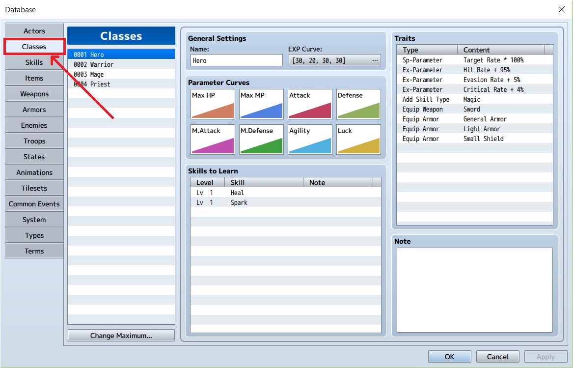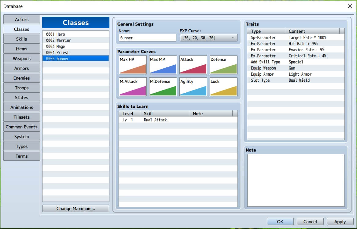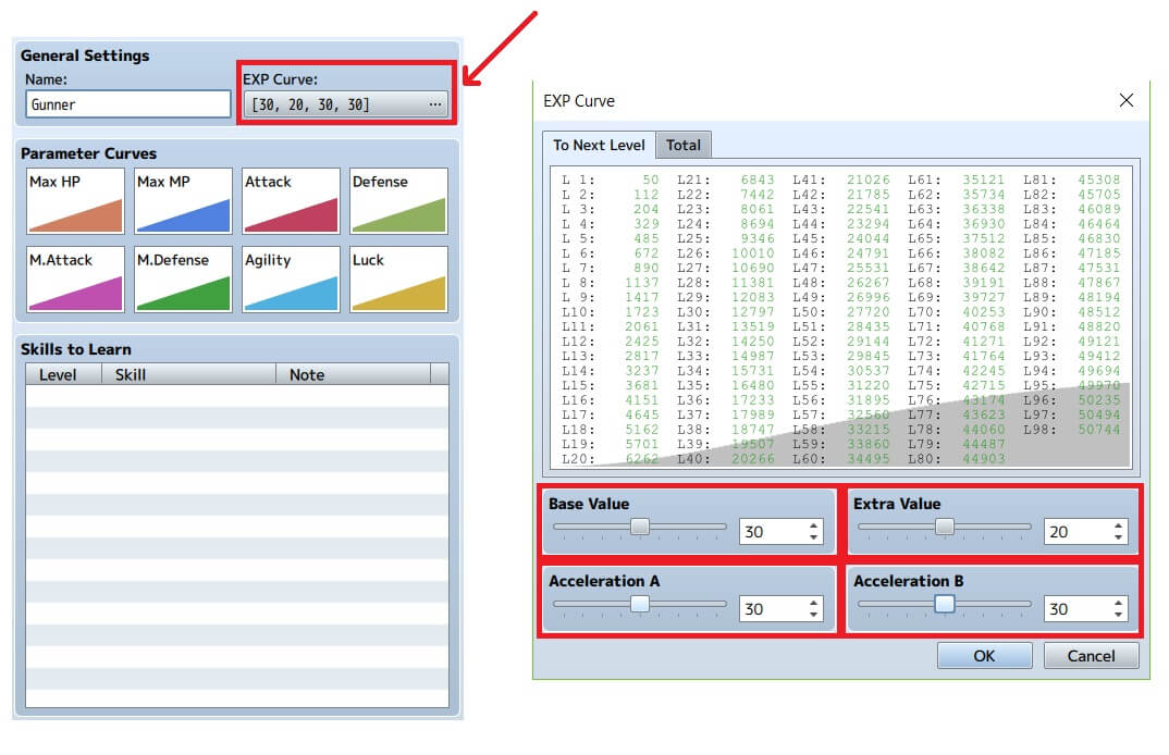 7. Disebelah nama, ada EXP Curve. Jika kita buka, kita dapat melihat dan mengatur besarnya exp yang diperlukan untuk naik level dari tiap karakter. “Base Value” mengatur besarnya EXP dasar yang diperlukan untuk naik level. “Extra Value” mengatur besarnya EXP tambahan yang diperlukan untuk naik level. “Acceleration A” mengatur perhitungan besarnya EXP tambahan yang diperlukan agar tidak monoton. Sedangkan “Acceleration B” akan menyesuaikan besarnya EXP agar tetap stabil dan tidak terlalu sulit untuk dicapai.