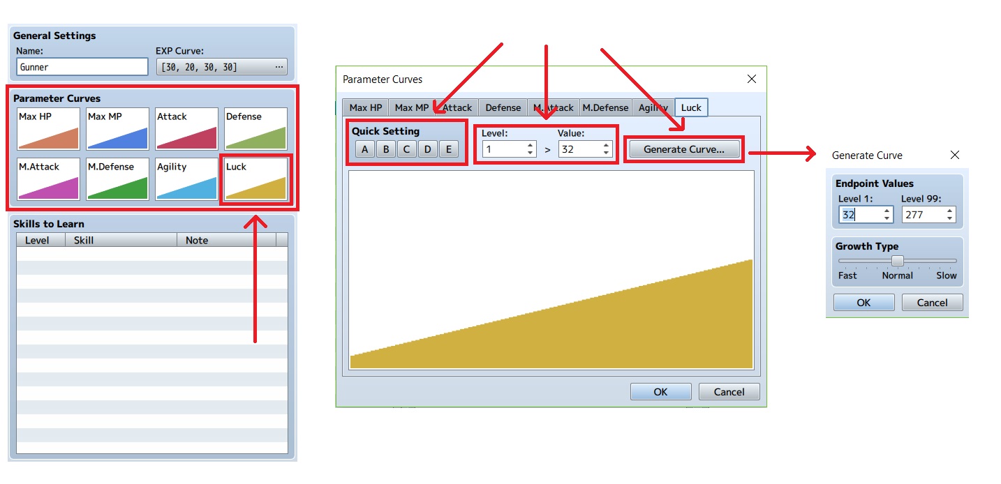 8. Ketika dibuka, ada beberapa fitur yang ada. “Quick Setting” akan membuat graph peningkatan secara otomatis sesuai dengan grade yang diinginkan. “Level & Value” untuk mengatur peningkatan tiap level secara manual. Sedangkan Generate Curve akan membuat graph secara otomatis sesuai dengan nilai dari Level 1 dan Level 99 serta “Growth Type” agar kita dapat mengatur perkembangannya.