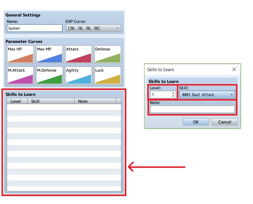 9. Terdapat juga bagian “Skills to Learn”. Disini kita bisa memasukkan skill-skill apa saja yang akan di dapat jika level sudah tercapai. Caranya adalah dengan double click pada baris, lalu tentukan Skill yang akan didapatkan dan tentukan levelnya lalu klik OK. Kita juga dapat memberikan note sebagai catatan agar kita tidak lupa. Sebagai contohnya, kita buat pada Level 1, kita akan mendapatkan Skill “Dual Attack”. Sehingga jika kita belum mencapai level 1 maka kita tidak akan dapat menggunakan skill ini.