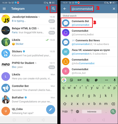 2. Klik ikon ‘Cari’ di pojok kanan atas, dan ketikkan keyword ‘@commentsbot’. Cari dan klik Comments Bot.