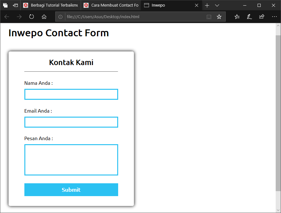 Demikian tutorial cara membuat Contact Form sederhana dengan Javascript. Semoga bermanfaat.