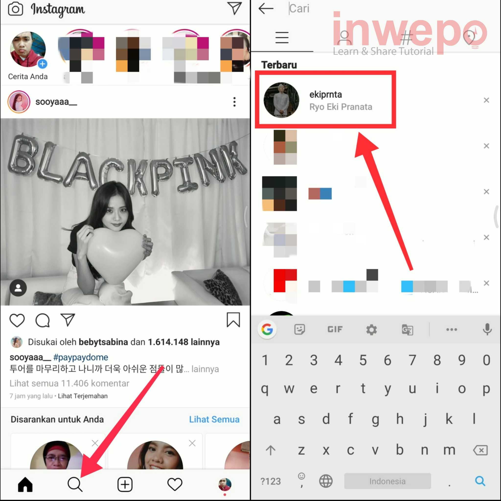 1. Langkah pertama, buka aplikasi Instagram pastikan kamu sudah mengupdate ke versi paling baru. Kemudian tap icon pencarian lalu cari akun @ekiprnta.