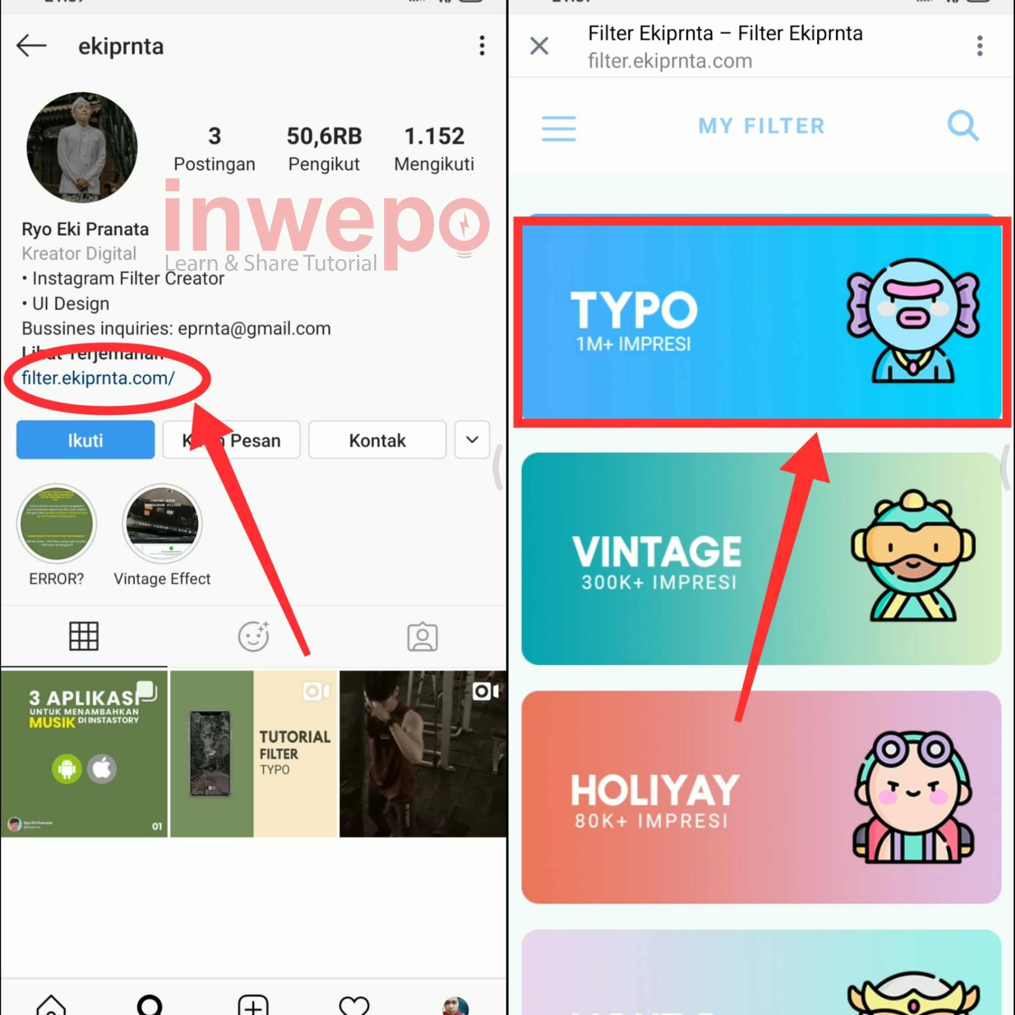 2. Langkah kedua, pada profil akun @ekiprnta tap langsung di situs filter.ekiprnta.com selanjutnya kamu akan diarahkan ke situs lain. Berikutnya pilih saja filter TYPO.