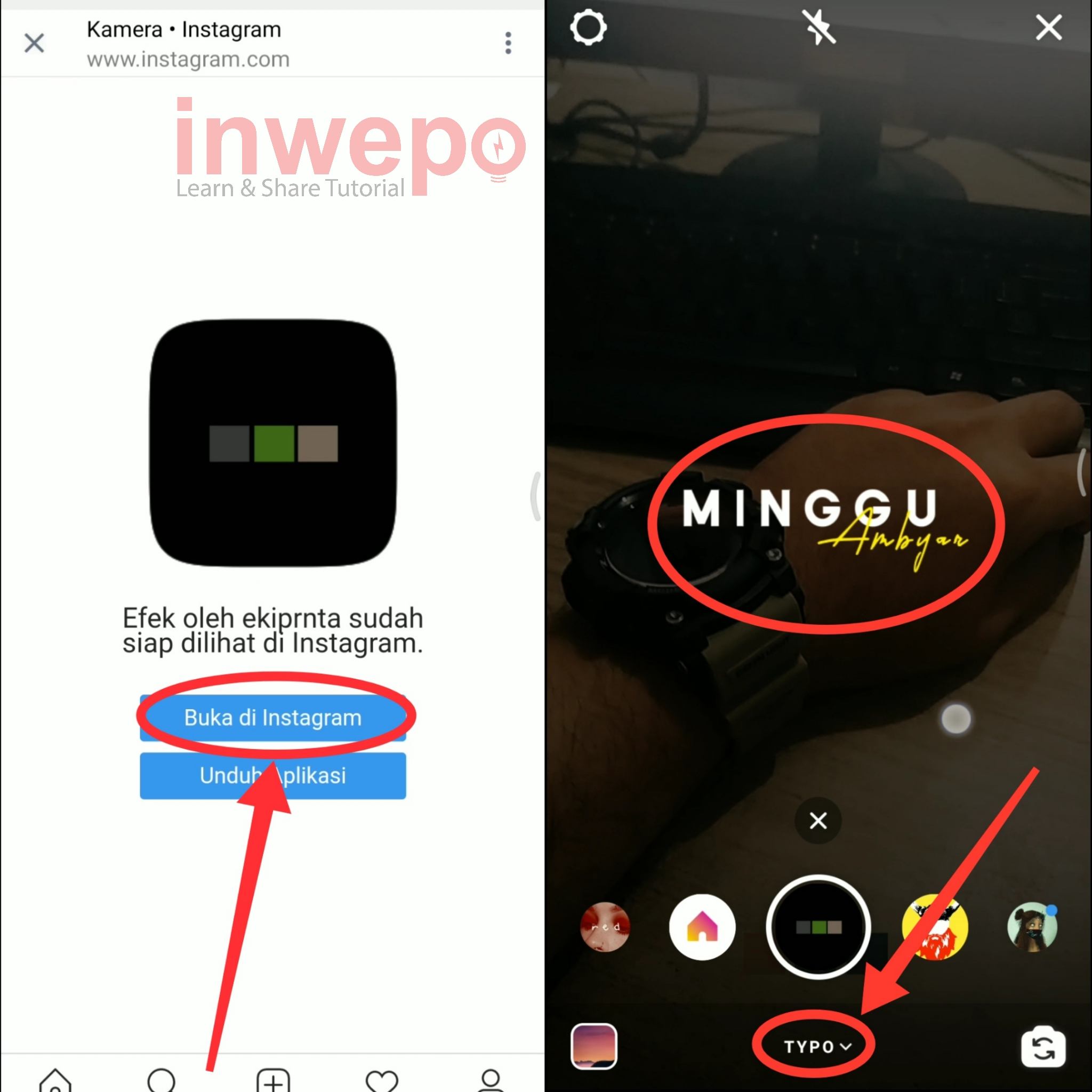 3. Langkah ketiga, langsung pilih menu Buka di Instagram. Selanjutnya kamu akan di arahkan lagi ke Instagram dan langsung mencoba filter tersebut. Tap tap pada layar untuk mengubah style kata-kata. Lalu berikutnya tap menu Typo yang berada di bagian bawah.