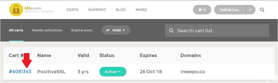 12. Jika sudah proses verifikasinya tunggu sesaat kurang lebih setengah jam, lalu masuk ke akun penyedia SSL jika status dinyatakan Active berarti sudah bisa digunakan. Klik nomor cart untuk mengunduh file yang akan di install ke server kita.