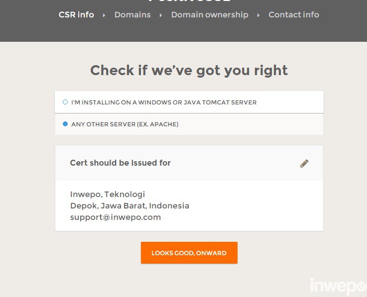 9. Selanjutnya pilih “ANY OTHER SERVER (EX.APACHE/NGINX)” bila kamu menginstallnya di server apache/nginx. Jika sudah memilih lanjut “LOOKS GOOD ONWARD”.