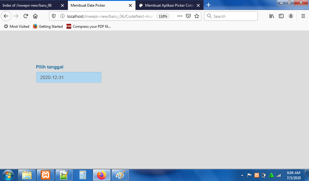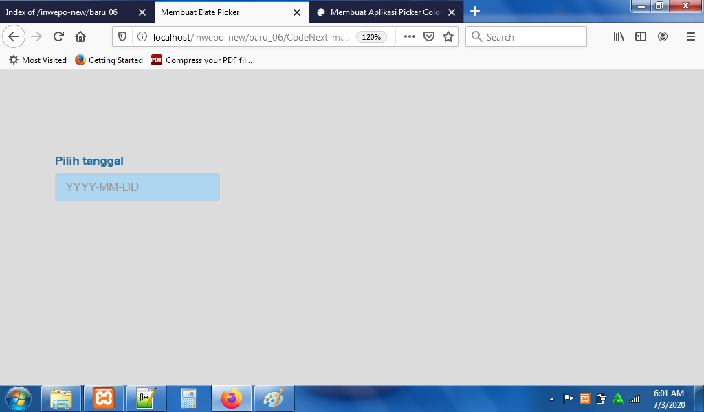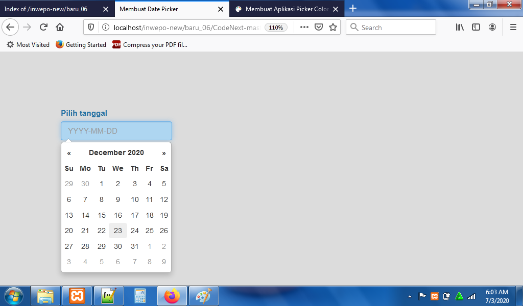 6. Reload alamat website http://localhost/DatePicker. Klik form untuk menampilkan kalender.
